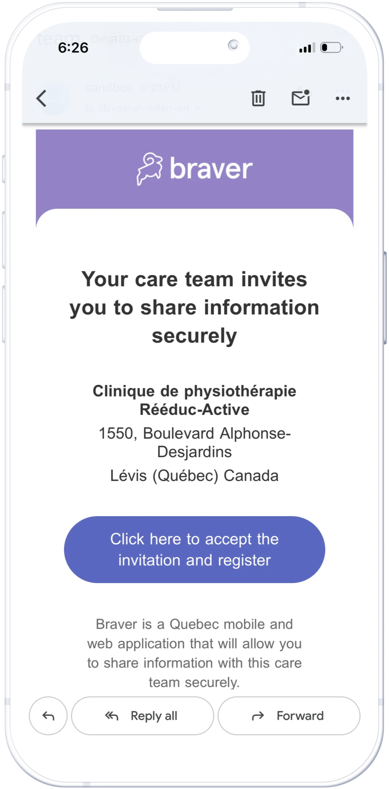 Your hospital, clinic, pharmacy, or care residence may invite you to join Braver. Activation is quick and simple: the organization grants you access — and covers all portal costs — so your care communication stays centralized in a simple and secure space.